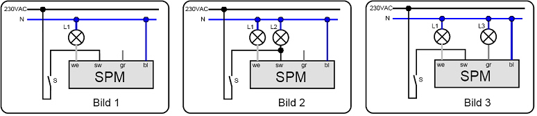 Die Schaltung nach Bild 3 wechselt von der Lampe L1 zur Lampe L3. L3 kann z.B. eine Energiesparlampe mit geringer Wattzahl sein um eine Notbeleuchtung sicherzustellen.